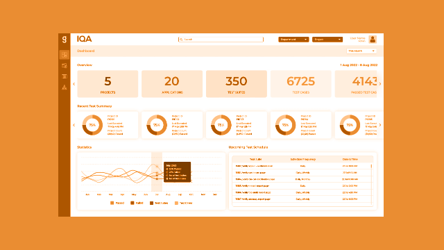 IQA has a comprehensive and visual dashboard that shows you critical metrics such as functional coverage, test suite execution statistics, and so on.